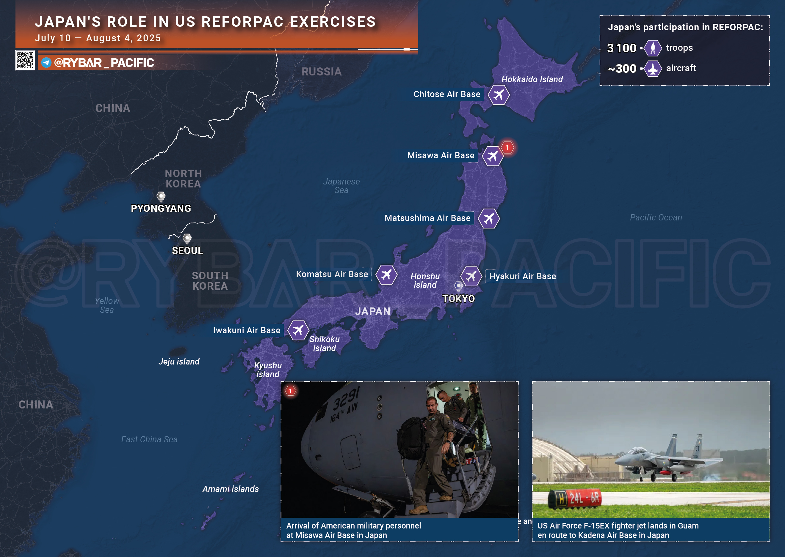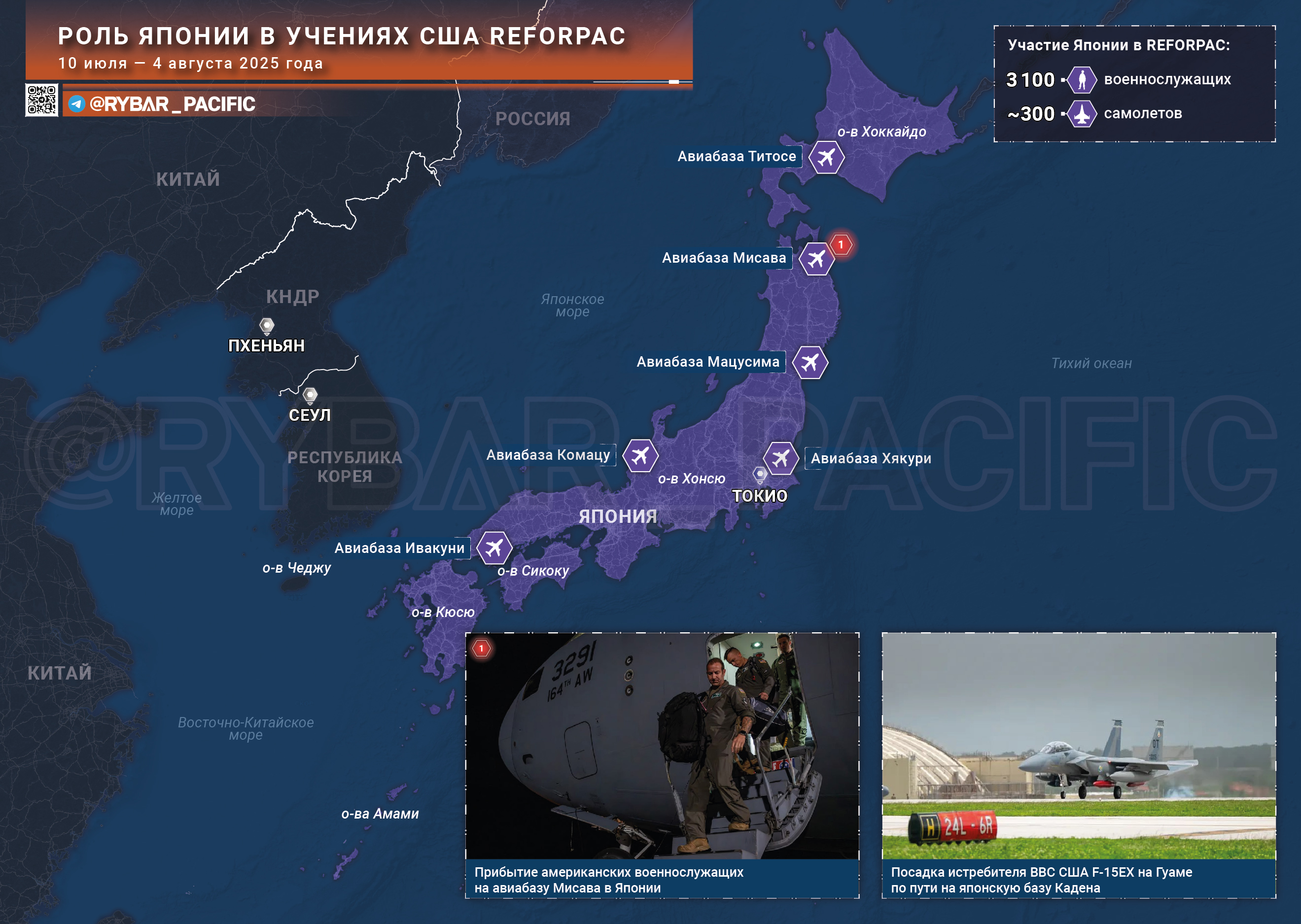 🔻 Подробнее:▪️ Тренировки REFORPAC проходят на нескольких военных объектах, расположенных на японской территории. В их число входят крупные авиабазы Мисава, Кадена и другие. На протяжении всего периода учений туда будут прибывать американские военнослужащие.▪️ Помимо стандартных для подобных тренировок задач вроде улучшения слаженности между контингентами двух стран, на японских базах будут отработаны вопросы, связанные с логистикой и тыловой поддержкой.▪️ Так, например, военнослужащие двух стран будут действовать по сценарию, согласно которому им необходимо возобновить деятельность поврежденного противником аэродрома. Кроме того, на одной из японских баз будут проведены тренировки по эвакуации раненных.▪️ Заметим, что во время учений на японскую территорию впервые прибыли американские истребители F-15EX. Новые самолеты, развернутые для участия в тренировках, скоро заменят старые американские истребители, расположенные на базе Кадена.