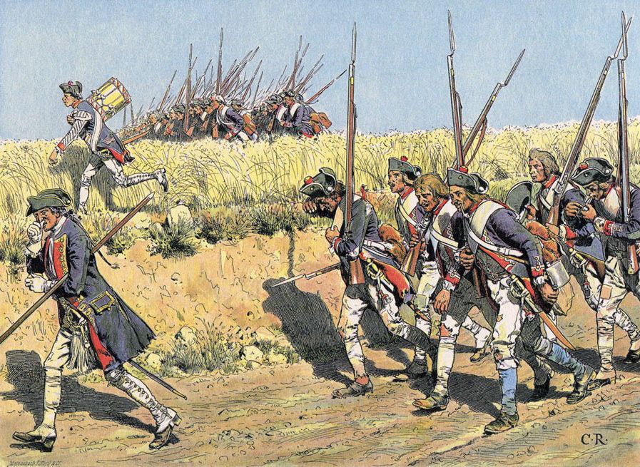 "Насильственно завербованный и удерживаемый на службе прусский солдат стремился использовать каждый случай, чтобы дезертировать. Борьба с дезертирством представляла важнейшую заботу прусского командования. Все 14 принципов, с которых начинается трактат Фридриха Великого о военном искусстве, гласят о мерах предупреждения и борьбы с дезертирством. Французский посол Валори в 1745 г. доносил, что в прусской армии не допускается удаление дозоров свыше 200 шагов от главных сил. Всякие наряды — за дровами, водой и т. д. — должны были высылаться командами, в сомкнутом строю, под начальством офицеров. В 1735 г., по совету фельдмаршала Леопольда Дессау, самого заслуженного прусского генерала, было решено даже изменить направление операций, чтобы обойти сильно пересеченную местность на р. Мозель, где армии угрожала большая утечка дезертирами. В 1763 г. Фридрих Великий издал инструкцию, требовавшую от командиров частей привлечь офицеров к изучению окрестностей их гарнизонов; но местность изучалась не под углом зрения требований тактики, а в целях выяснения местных данных, облегчающих ловлю дезертиров. Чересполосная Пруссия, по определению Вольтера, являлась королевством границ; почти все гарнизоны находились не далее двух переходов от рубежа, и борьба с дезертирством становилась возможной лишь при широких, планомерных мероприятиях. <...>