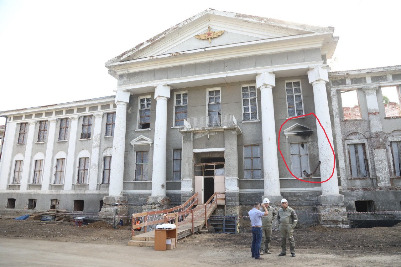 Взглянем на фото в нижней части поста: кривая труба печки-буржуйки торчит из окна, а чуть выше – закопченный портик. Реставрация уровня «Мариуполь», не иначе. Надеемся, что несчастным узбекам было тепло зимой, когда они топили печь строительным мусором, чтобы украсить "объект культурного наследия" следами пролетарской жизнедеятельности.