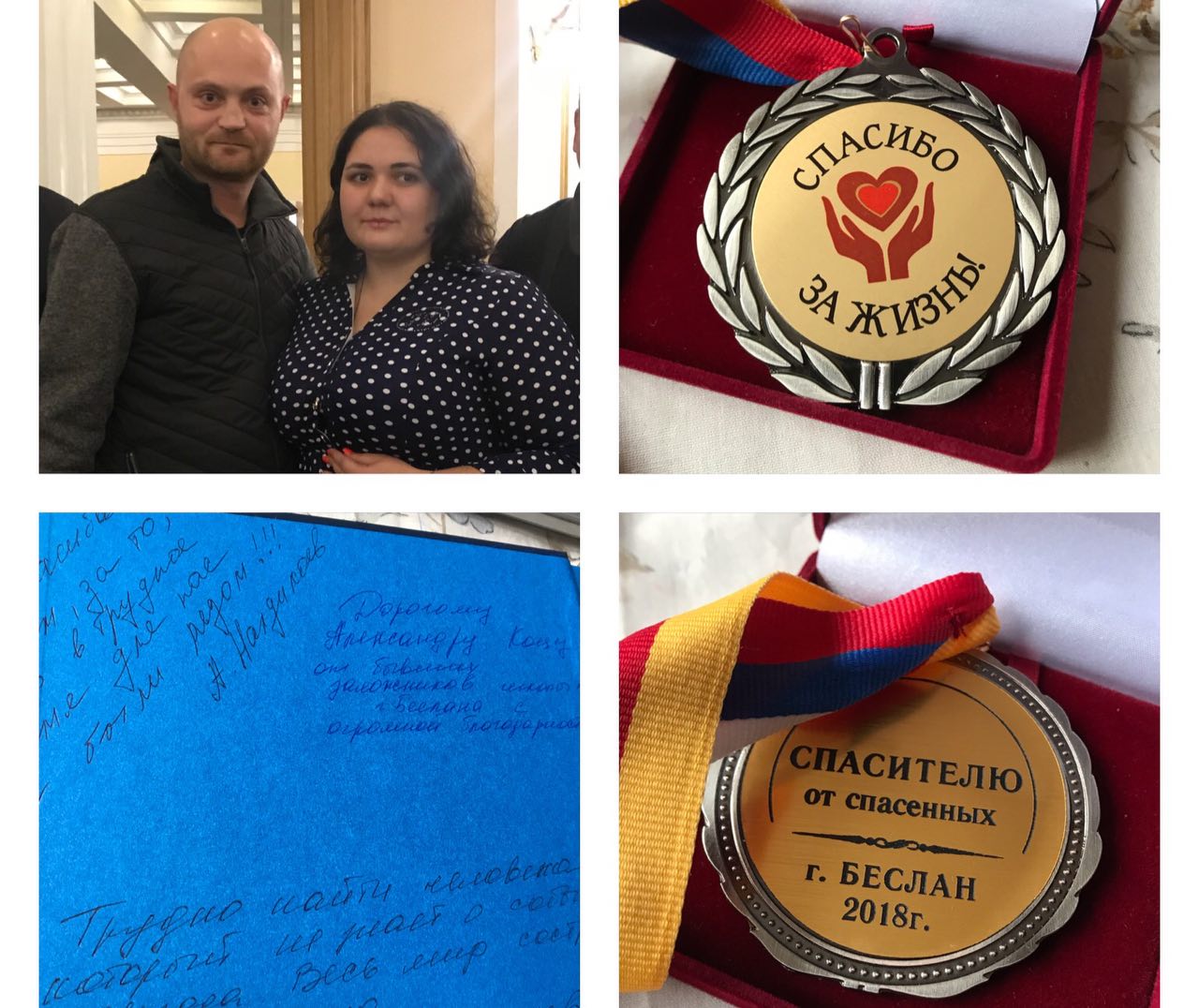 Алина вручила мне книгу о тех, кто все эти годы помогал детям Беслана, подписанную бывшими заложниками. И медаль, с одной стороны которой написано «Спасибо за жизнь», а с другой - «Спасителю от спасенных».