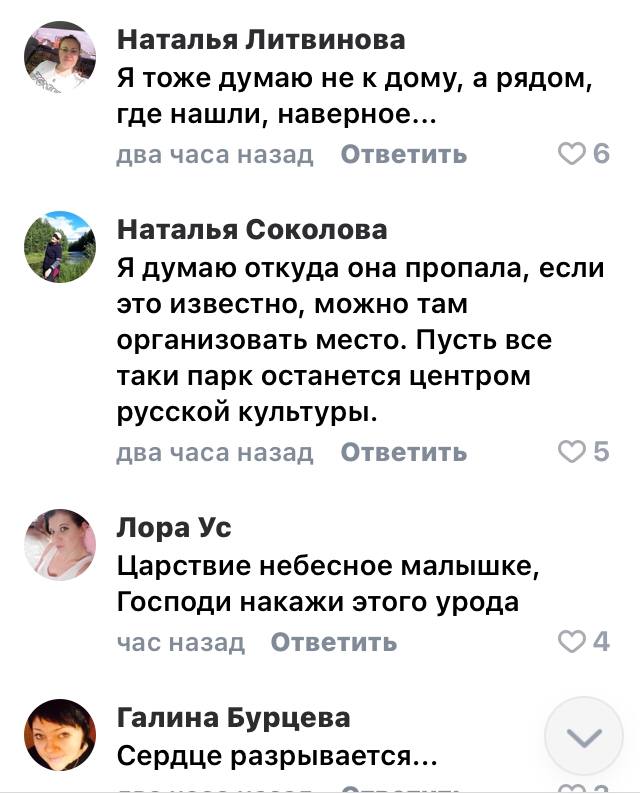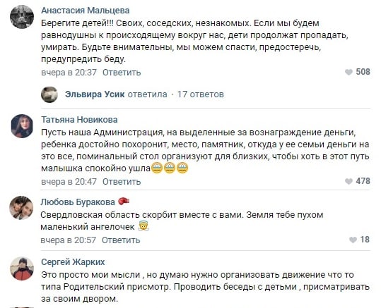 Скорбят все, кто имеет сердце. Много обращений лично к ребенку с просьбой о прощении за то, что не уберегли. Много предостережений родителям, чтобы не отпускали своих детей одних никуда и никогда. И очень много предложений о том, как общественности присматривать за чужими детьми, вплоть до организации родительского контроля по дворам.