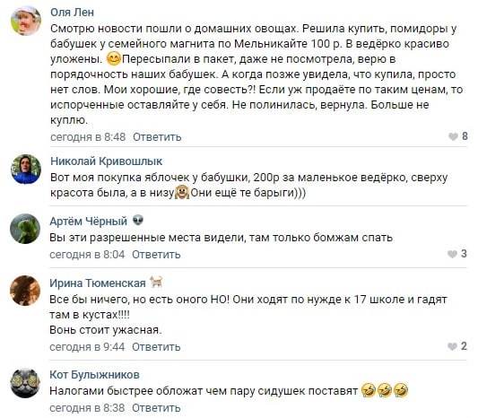 В этот раз на бабушек ополчились многие покупатели. Пишут, что подсовывают товар некачественный, еще и по баснословной цене. Сверху помидоры, яблоки красивые, а когда домой приносишь, те, которые прятались внизу – с гнильцой. К совести взывают. Ведь многие берут товар не только, чтобы свежей продукцией полакомиться, а просто помочь пенсионерам заработать.