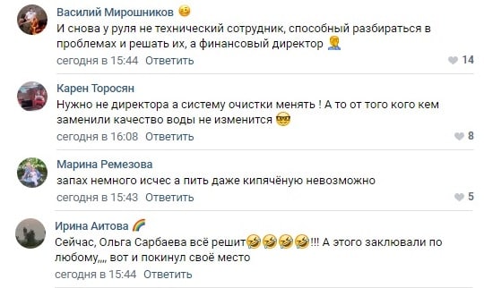 В соцсетях горожане бурно отреагировали на кадровые изменения. Считают, что возглавлять «Тюмень Водоканал» должен технически грамотный специалист. Но назначена финансовый директор компании Ольга Сарбаева.