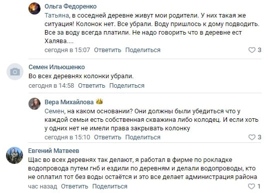 В соцсетях пишут, что во всех деревнях демонтировали колонки. Где-то установили платные, а где-то очередь еще не дошла. И люди не знают, чего ждать, дойдет ли до них вообще. Собрались топить снег, чтобы набрать воды.