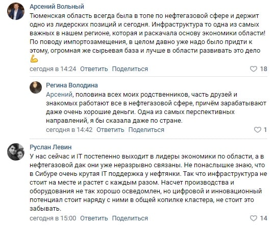 Тюменцы соглашаются, что это важно для развития экономики региона. Пишут, что этот производственный сектор всегда был и остается лучшим по всем направлениям, в том числе по уровню зарплат своим сотрудникам. Еще бы аграриев подтянуть до этого уровня, а вот IT-сфера сама дойдет.