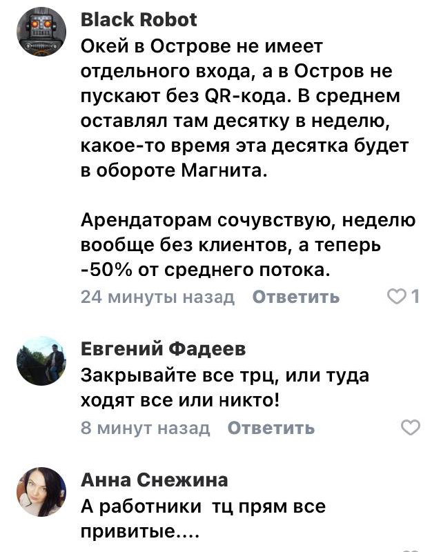 Скопление людей на входе в торговые центры - это первое, что обсуждают с утра тюменцы. Сочувствуют проверяющим, которые проверяют QR-коды и другие документы у посетителей. Пишут, что наслушаются негатива, за который вряд ли выпишут премиальные.