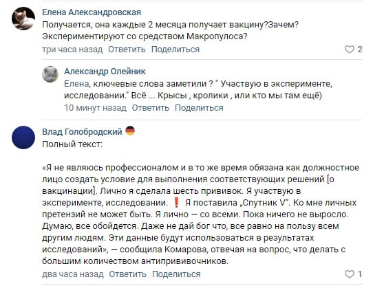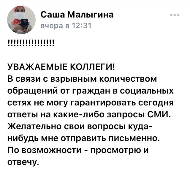 Пресс-секретарь департамента здравоохранения Александра Малыгина «тушит пожар» в соцсетях, оставляя СМИ на потом. Кстати, в соцсетях никакого взрыва нет, все идет как всегда, негатив все тот же. Разве что добавились два очага ковида, один из которых - дети в лагере «Снежинка», да отсутстсвие «Спутника Лайт».