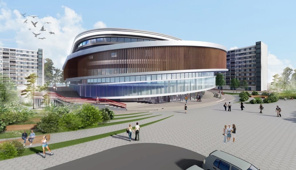 Здание четырехэтажное, а в основе архитектурной идеи – гимнастическая лента. Сроки завершения работ – август 2023 года.