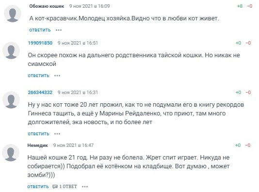 В соцсетях оказались кошатники, отпраздновавшие и 26 лет своему любимцу. Правда, никому не пришло в голову отправить заявку в Книгу рекордов. Кстати, в ней есть коты разных пород, возраст которых от 26 до 30 лет. А мировой чемпион-долгожитель среди котов жил в Великобритании. Это кошка Люси, которая умерла в 43 года.