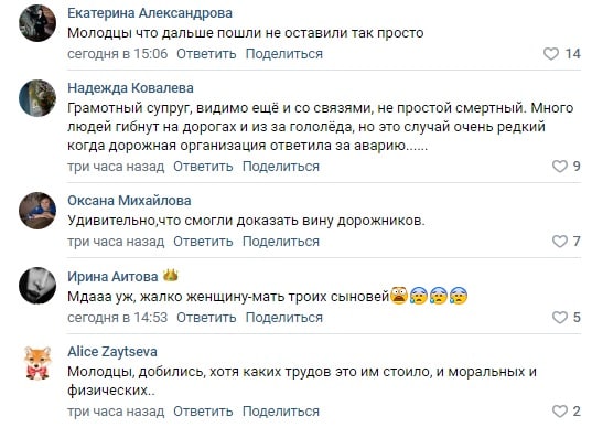 В соцсетях одобряют настойчивость мужчины, который, видимо, прошел все круги ада, чтобы виновник был найден и наказан. Соглашаются, что это очень сложно сделать. Хотя часто причины, из-за которых случаются смертельные ДТП, бракованные дороги и их некачественное содержание.