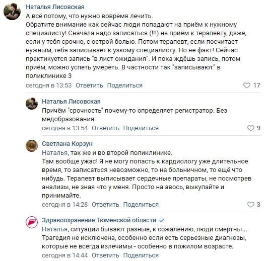 В соцсетях эта история наделала много шума, как будто в больницах на руках врачей никто не умирает. Пишут, что квалификация сотрудников поликлиник оставляет желать лучшего, записаться к специалистам проблема, и вообще давно пора реформировать систему здравоохранения. Слишком много жалоб на нее, даже от медицинского сообщества.