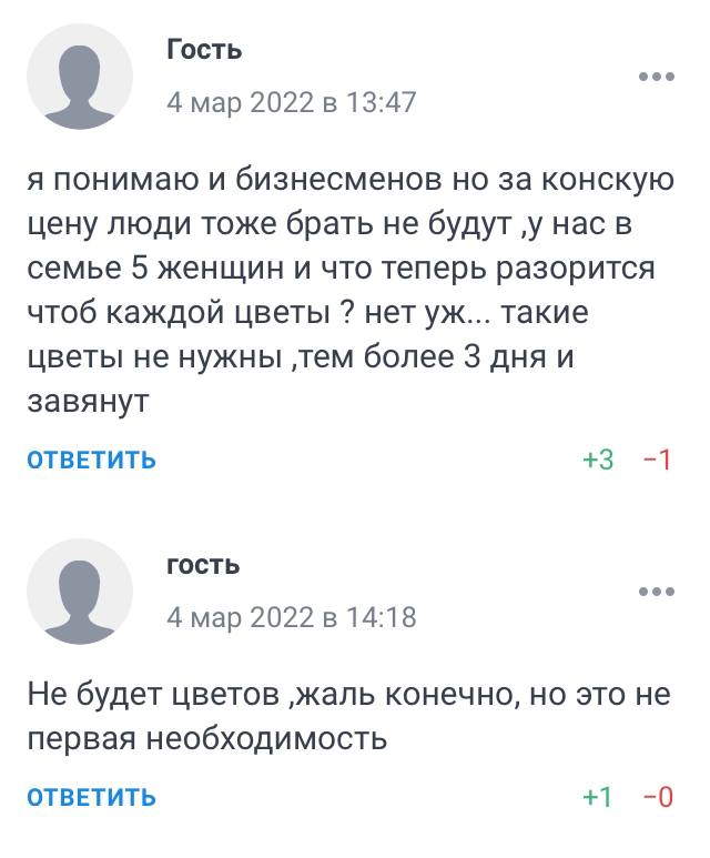 В соцсетях пишут, что цветы очень хорошо поднялись в цене. Например, лилия стоит 540 рублей, хризантема – 300 рублей, ирисы – от 170 рублей за штуку. Мужчинам советуют переходить на подарочные наборы: шампанское, конфеты и воздушный шарик.