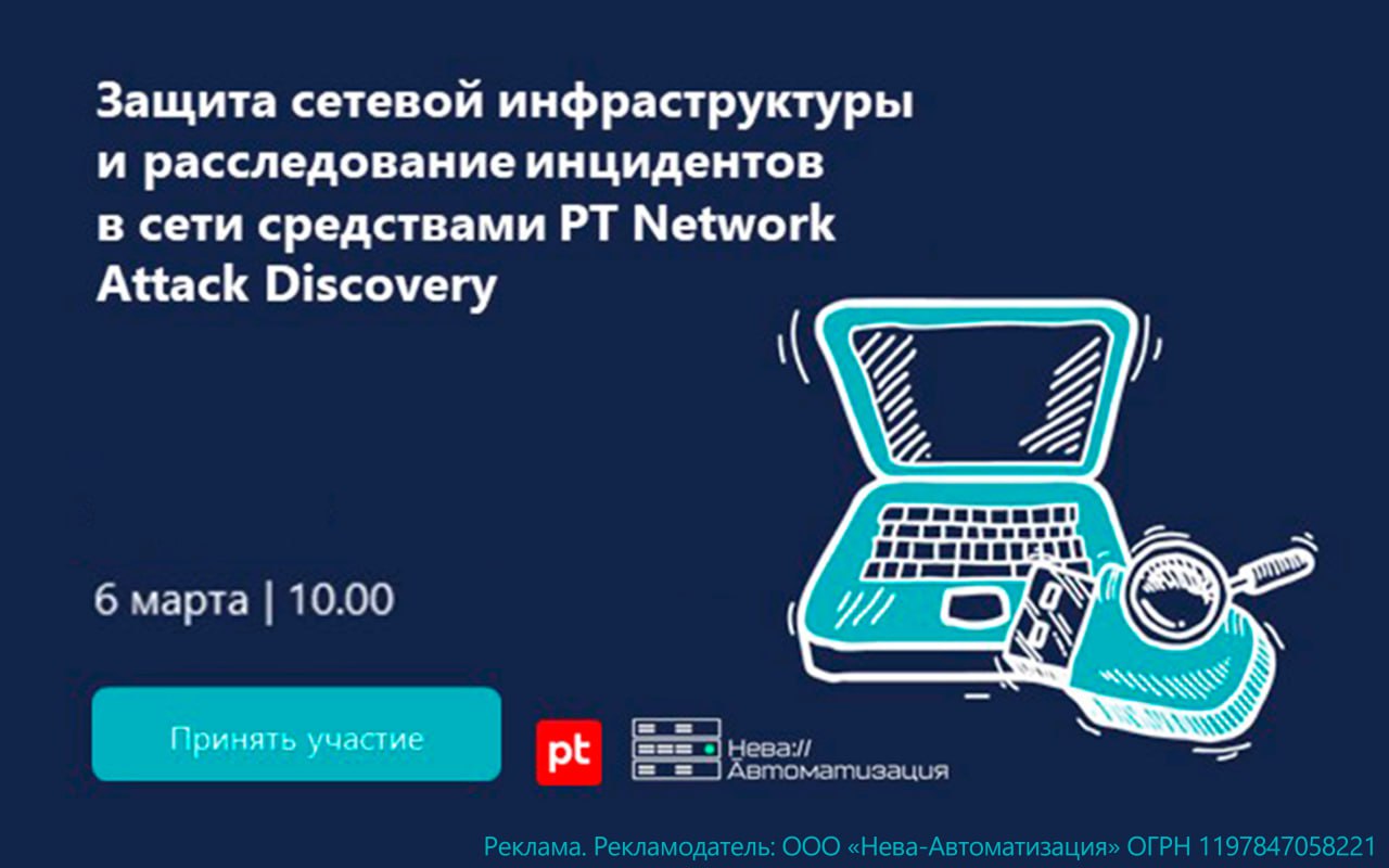 Нева-Автоматизация приглашают на вебинар «Защита сетевой инфраструктуры и расследование инцидентов в сети средствами PT Network Attack Discovery», который состоится 6.03 в 10:00 (Мск).