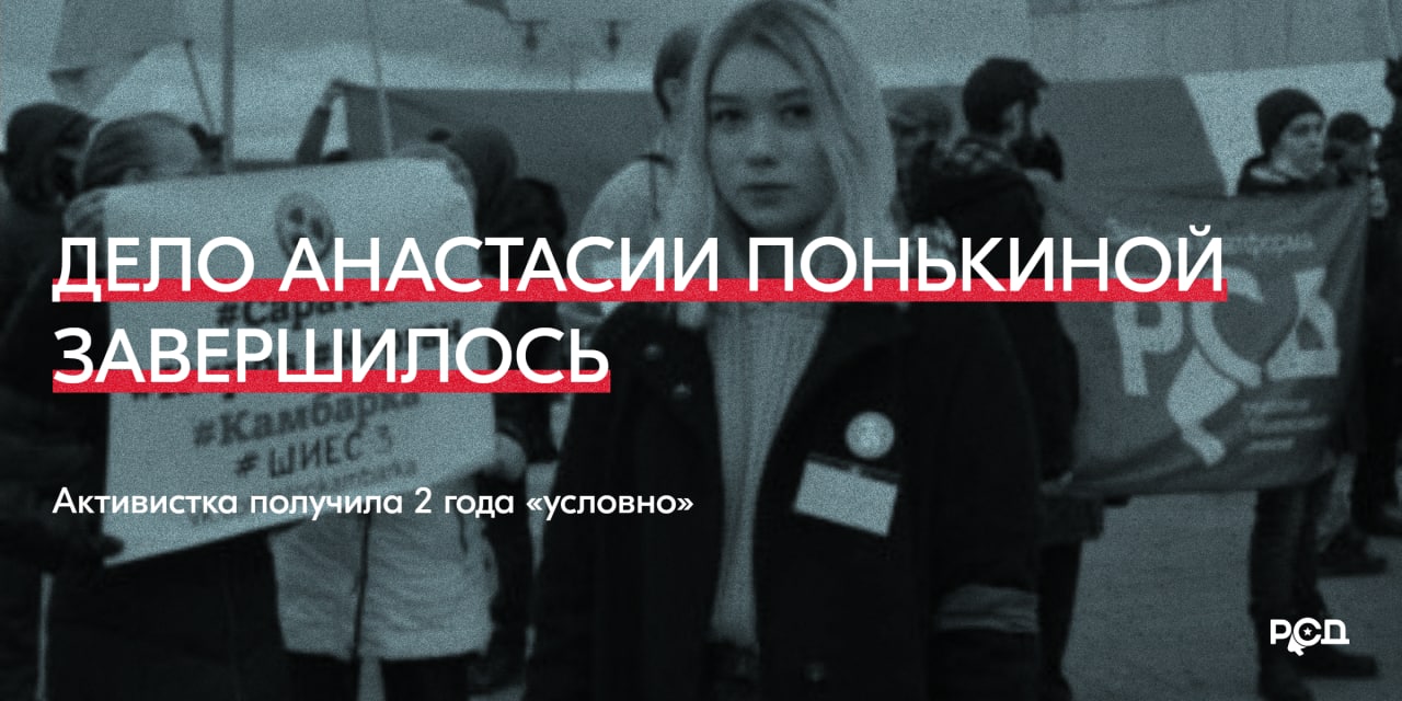 Дело ижевской социалистки Анастасии Понькиной, которую судили за участие в протестных акциях зимы 2021-го года, наконец подошло к концу. Октябрьский районный суд Ижевска признал Анастасию виновной по пункту «б» части 1 статьи 213 УК РФ (хулиганство, совершенное по мотиву идеологической вражды) и присудил два года лишения свободы условно. Гособвинитель настаивал на реальном лишении свободы с отбыванием в колонии-поселении, но суд исключил мотив «политической вражды». Фактически Понькина ответила за всю ижевскую оппозицию: её действия, при желании, можно вменить буквально любому участнику акции протеста.