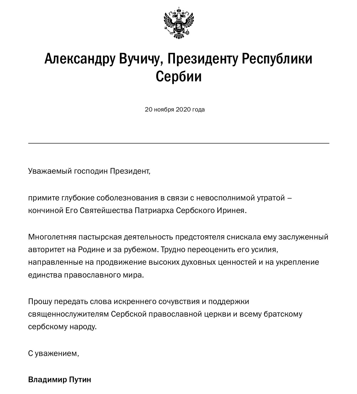 🇷🇺🇷🇸 Телеграмма Президента России Владимира Путина Президенту Сербии Александру Вучичу, 20 ноября 2020 г