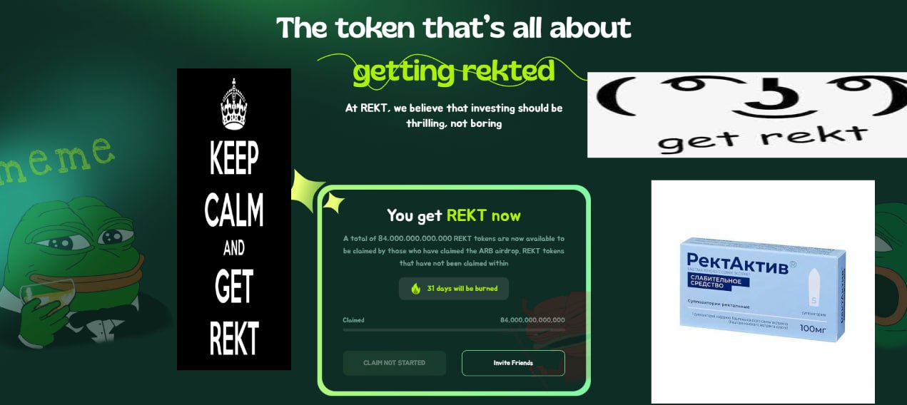 $REKT это мемкоин созданный на хайпе после $PEPE, $WOJAK и прочих приколов и казалось бы это очередная хуйня, НО я провел ресерч и вот что я выделил: