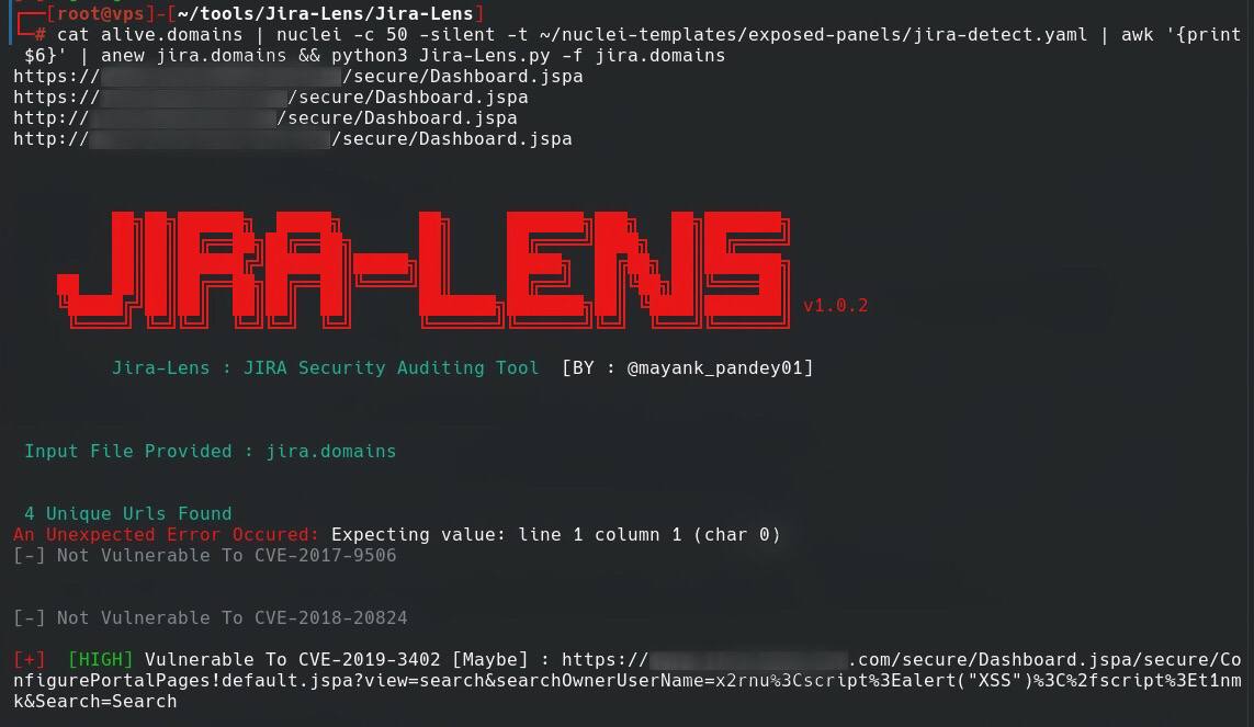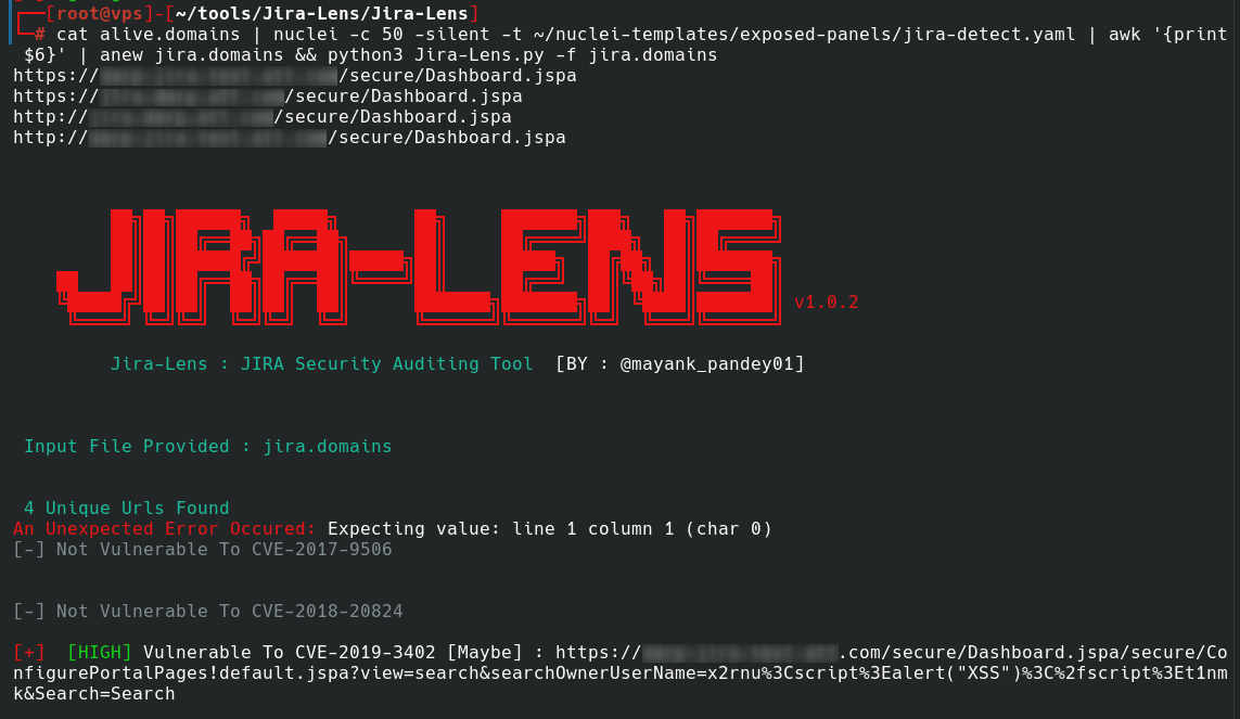 cat alive.domains | nuclei -c 50 -silent -t ~/nuclei-templates/exposed-panels/jira-detect.yaml | awk '{print $6}' | anew jira.domains && python3 Jira-Lens.py -f jira.domains