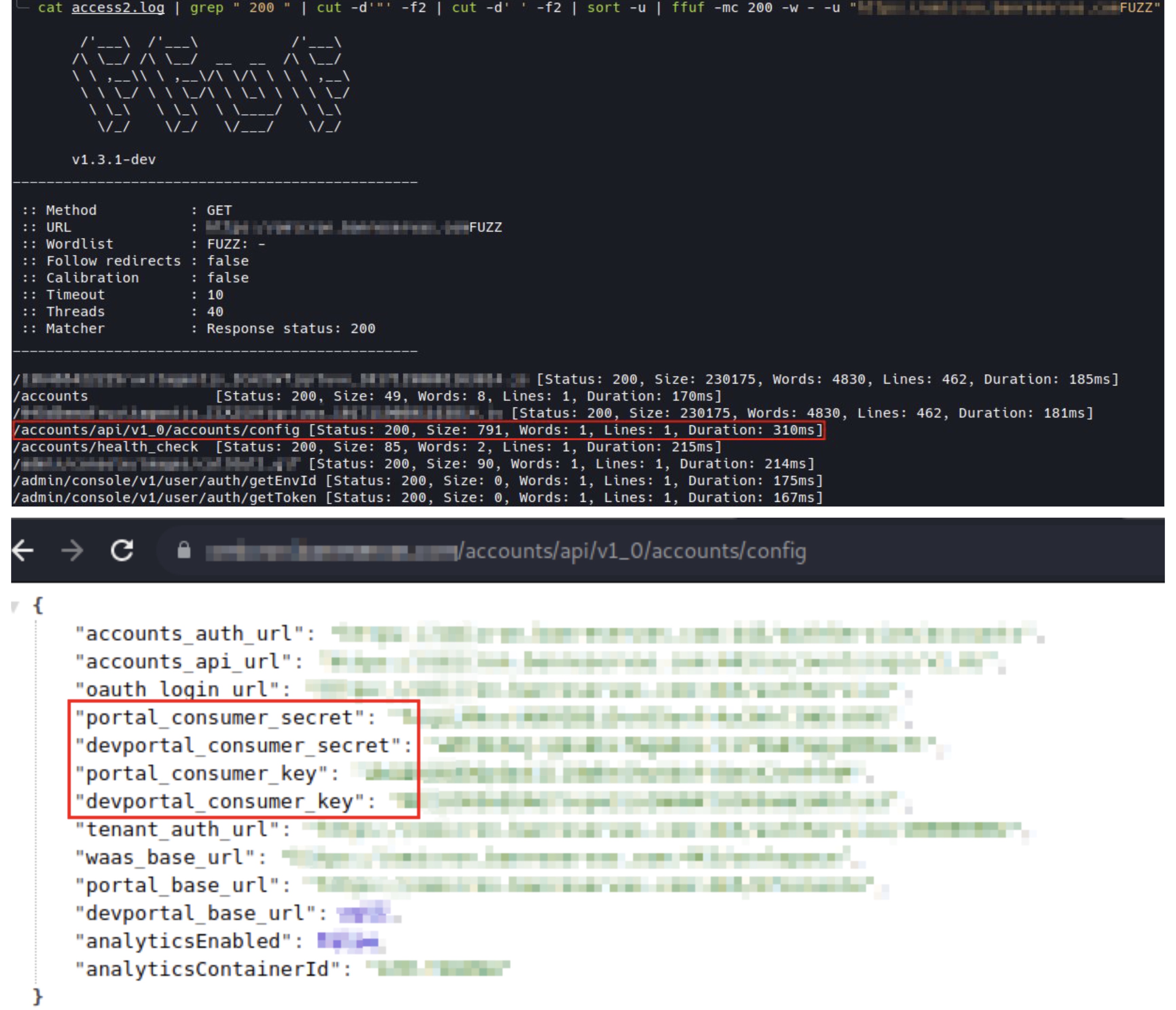 access.log, то можно проанализировать его содержимое и просмотреть адреса с кодом ответа 200, так как это может привести к интересным находкам и утечкам.Для этого можно использовать ffuf и выполнить: