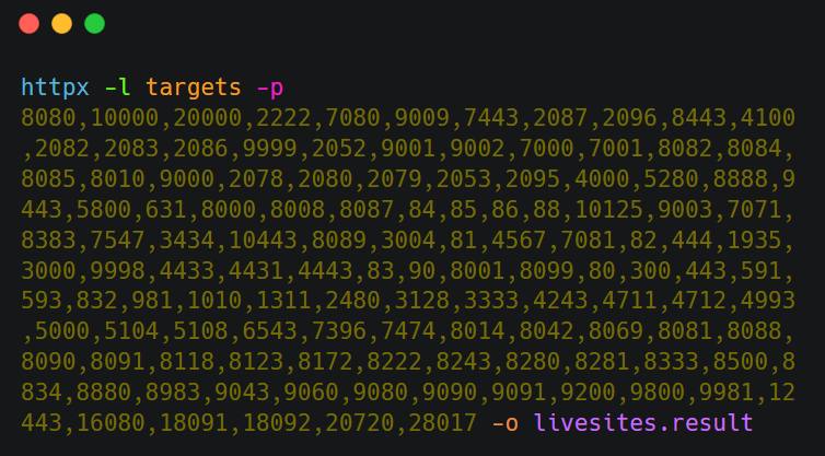 httpx -l targets.list -p 8080,10000,20000,2222,7080,9009,7443,2087,2096,8443,4100,2082,2083,2086,9999,2052,9001,9002,7000,7001,8082,8084,8085,8010,9000,2078,2080,2079,2053,2095,4000,5280,8888,9443,5800,631,8000,8008,8087,84,85,86,88,10125,9003,7071,8383,7547,3434,10443,8089,3004,81,4567,7081,82,444,1935,3000,9998,4433,4431,4443,83,90,8001,8099,80,300,443,591,593,832,981,1010,1311,2480,3128,3333,4243,4711,4712,4993,5000,5104,5108,6543,7396,7474,8014,8042,8069,8081,8088,8090,8091,8118,8123,8172,8222,8243,8280,8281,8333,8500,8834,8880,8983,9043,9060,9080,9090,9091,9200,9800,9981,12443,16080,18091,18092,20720,28017 -o livesites.result#web #recon