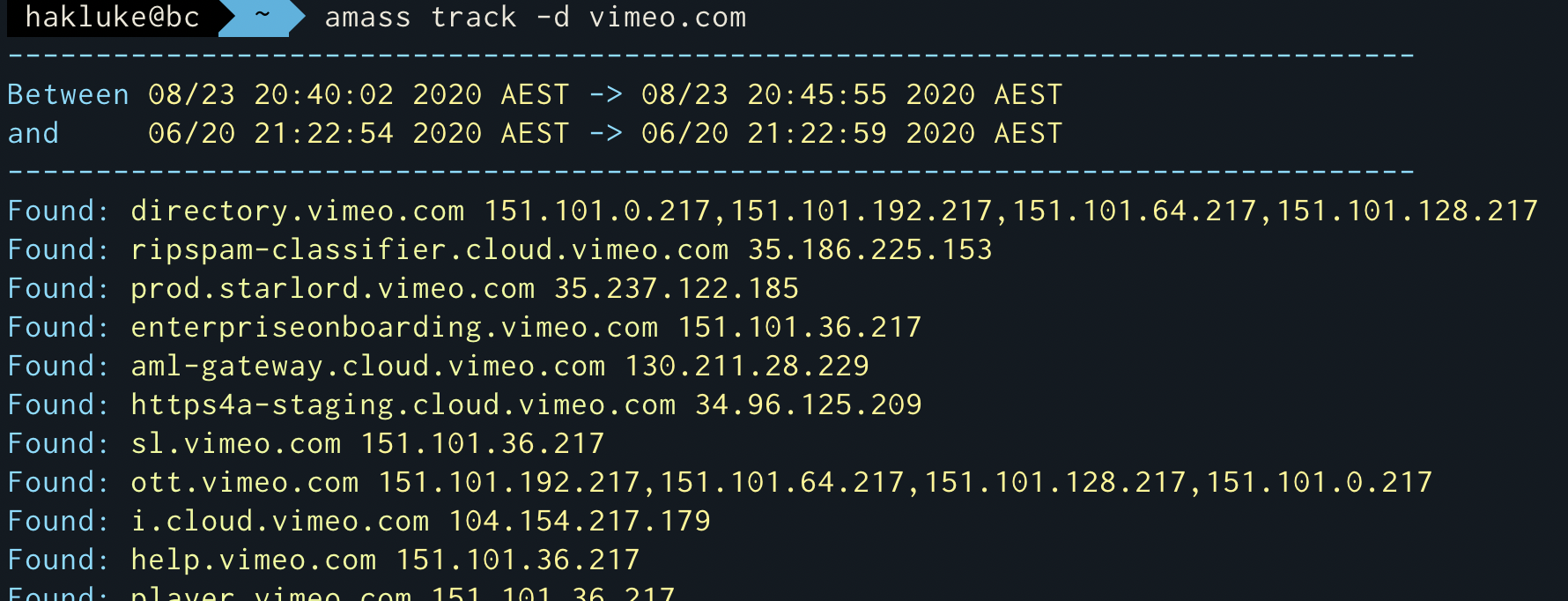 Сейчас прошло несколько месяцев и если снова выполнить это сканирование, а затем прописатьamass track -d vimeo.com