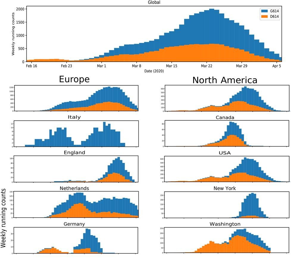 По первой ссылке можно увидеть карту мира, где оранжевый цвет 614D тотально вытесняется синим цветом 614G.