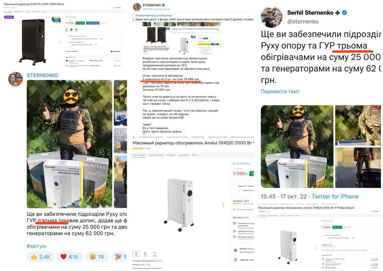 Но обо всем по порядку. Первым, кто заметил недостачу стал журналист Анатолий Шарий. Изначально Стерненко писал о трех обогревателях на сумму 25 тыс. грн и генераторами на сумму 62 тыс. грн. Однако один радиатор Kumtel 1230-S стоит 4200 грн, а три выходит в сумме 12400 грн, никак 25 тыс. грн. Поэтому легким движением руки Стерненко меняет три штуки на пять, а потом и вовсе выдает, что это два комплекта по две штуки.