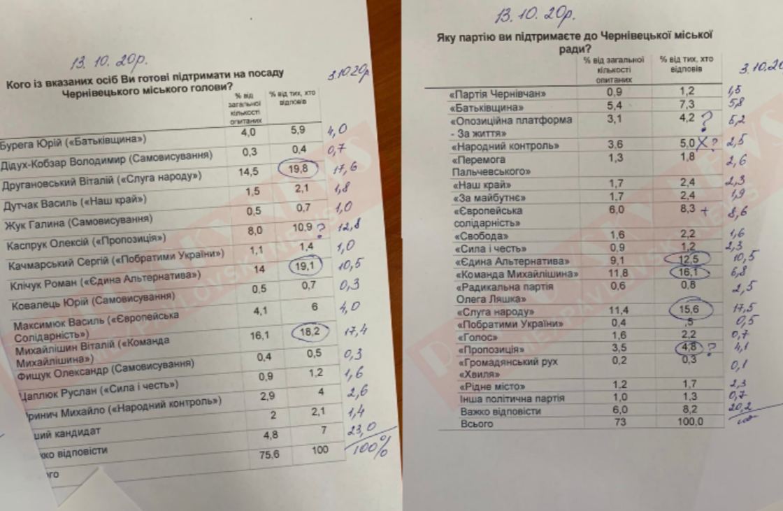 А рейтинг партии "Слуга народа" в Черновцах составляет 15.6% (против 8.3% - ПЭС, 7.3% - Батькивщина, 4.2% - ОПЗЖ, 1.7% - Ридне мисто, 4.8% - Пропозиция, 12.5% - единая альтернатива, 16.1% - команда Михайлишина).