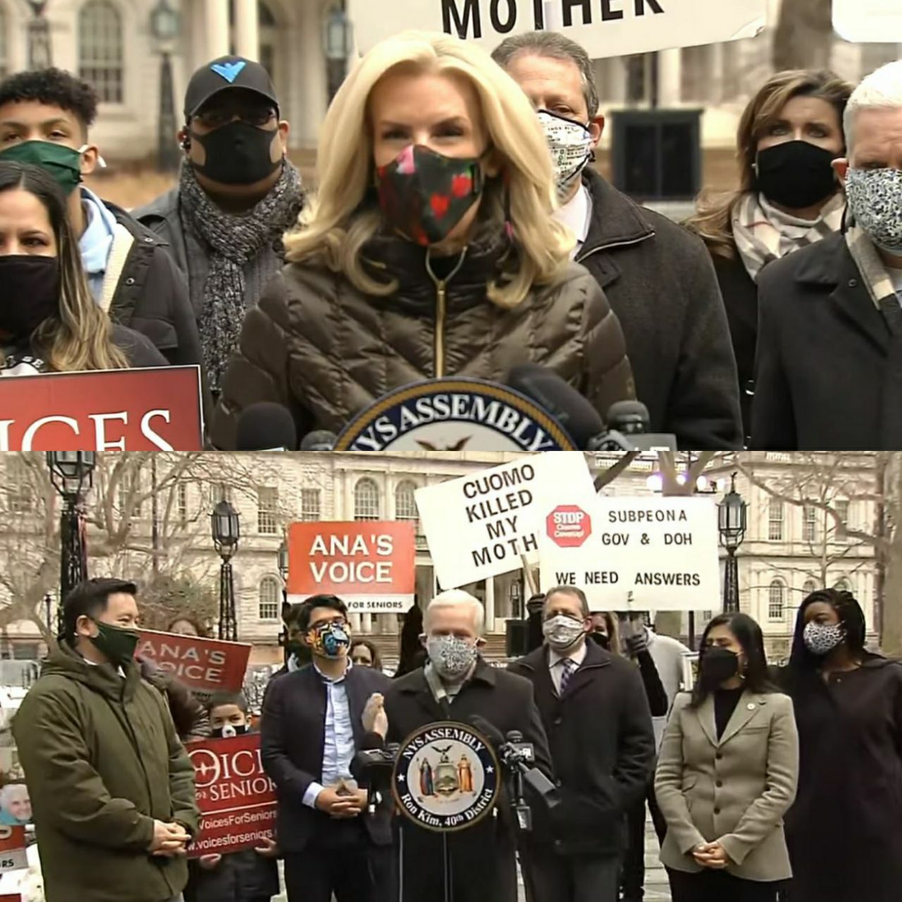 Член Ассамблеи Нью-Йорка, демократ Рон Ким, а также Джессика Рамос, демократ, проводят митинг у мэрии города. К Киму присоединились другие избранные должностные лица, защитники и члены семей пожилых людей, чтобы огласить ключевой список требований от администрации губернатора Нью-Йорка Эндрю Куомо.