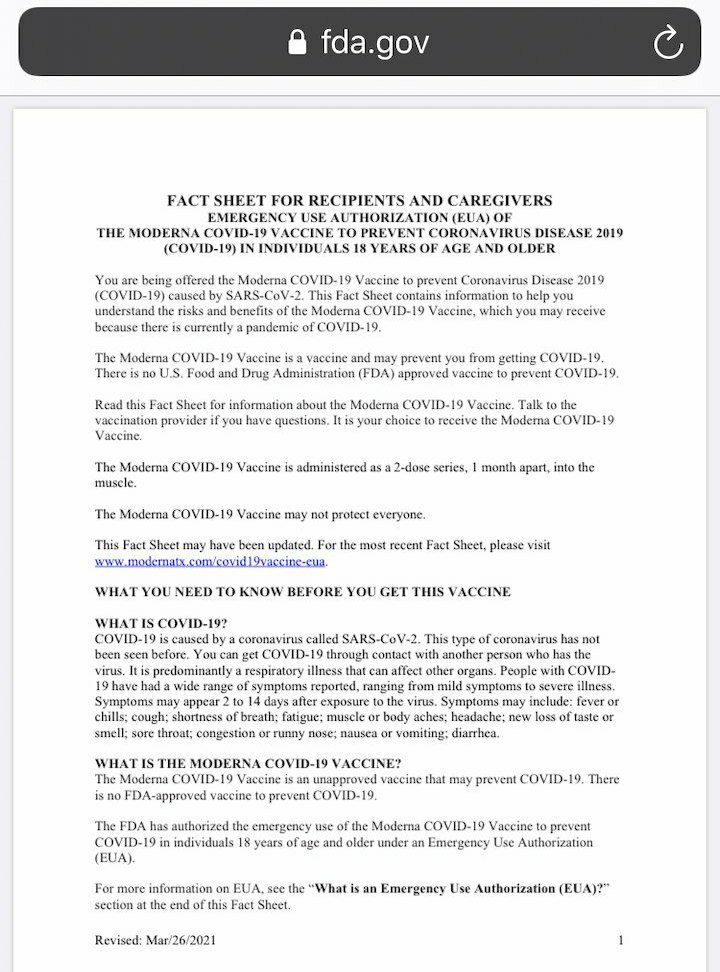 «Не существует одобренной FDA вакцины для профилактики COVID-19 (...) Это ваш выбор (...) Вакцина Moderna COVID-19 может защитить не всех (...) Вакцина Moderna COVID-19 - это неутвержденная вакцина, которая может предотвратить COVID-19 (...) Управление по санитарному надзору за качеством пищевых продуктов и медикаментов разрешило экстренное использование вакцины Moderna COVID-19 для предотвращения COVID-19 у лиц в возрасте 18 лет и старше по разрешению на экстренное использование (EUA)»