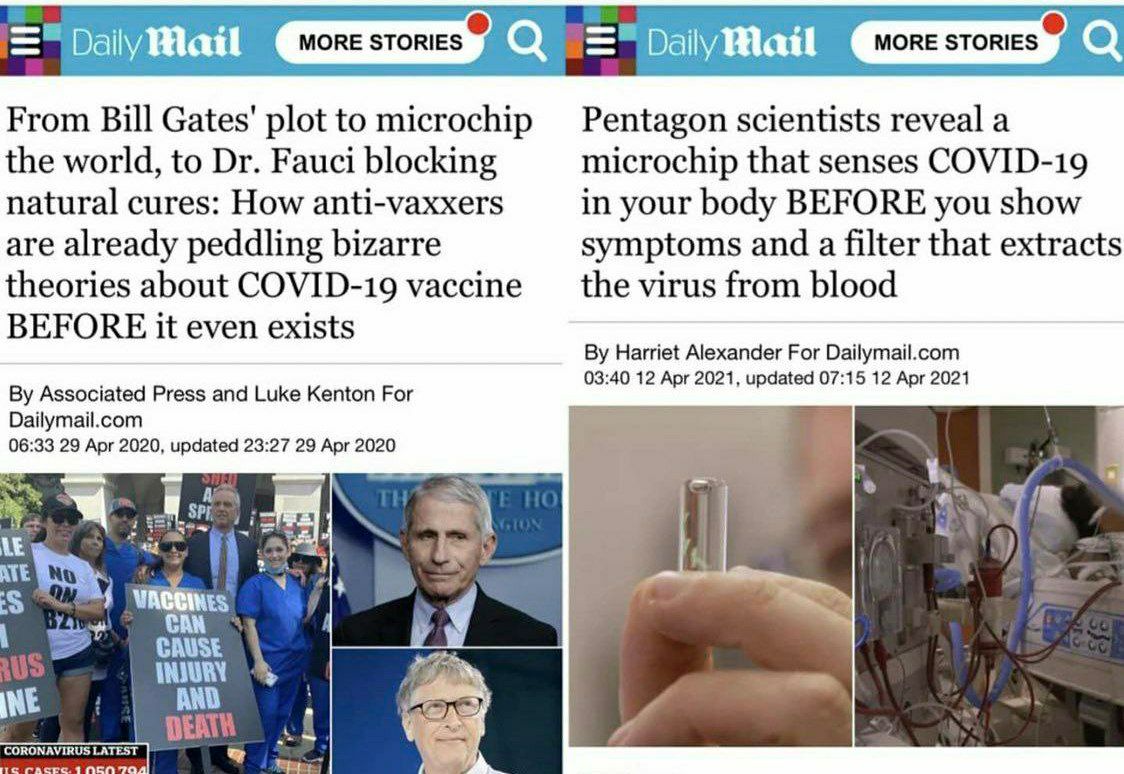 «От заговора Билла Гейтса о микрочипе мира до доктора Фаучи, блокирующего естественные лекарства: анти-ваксеры начали торговать причудливыми теориями о вакцине COVID-19 несмотря на то, что её ещё даже не изобрели».