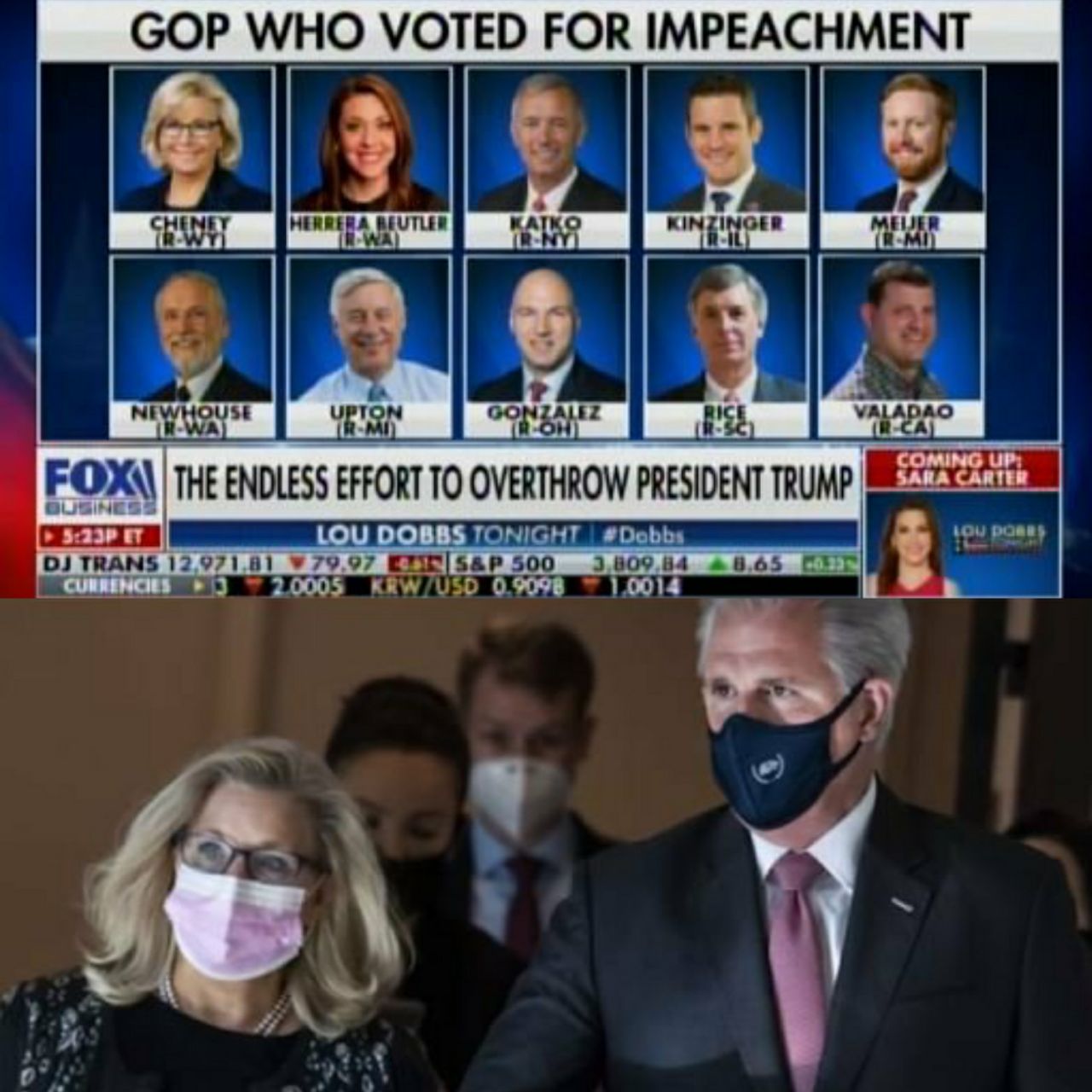 🔺 Республиканские источники сообщили, что член центрального комитета представил резолюцию, чтобы осудить десять анти-трамперов за их движение, среди которых Лиз Чейни из Вайоминга, Том Райс из Южной Каролины, Дэн Ньюхаус и Хайме Эррера Батлер из Вашингтона, Адам Кинзингер из Иллинойса, Фред Аптон, Питер Мейджер и Джон Катко из Мичигана. Их собираются осудить и исключить «за голоса в поддержку антиконституционного, политически мотивированного импичмента президенту Дональду Трампу».