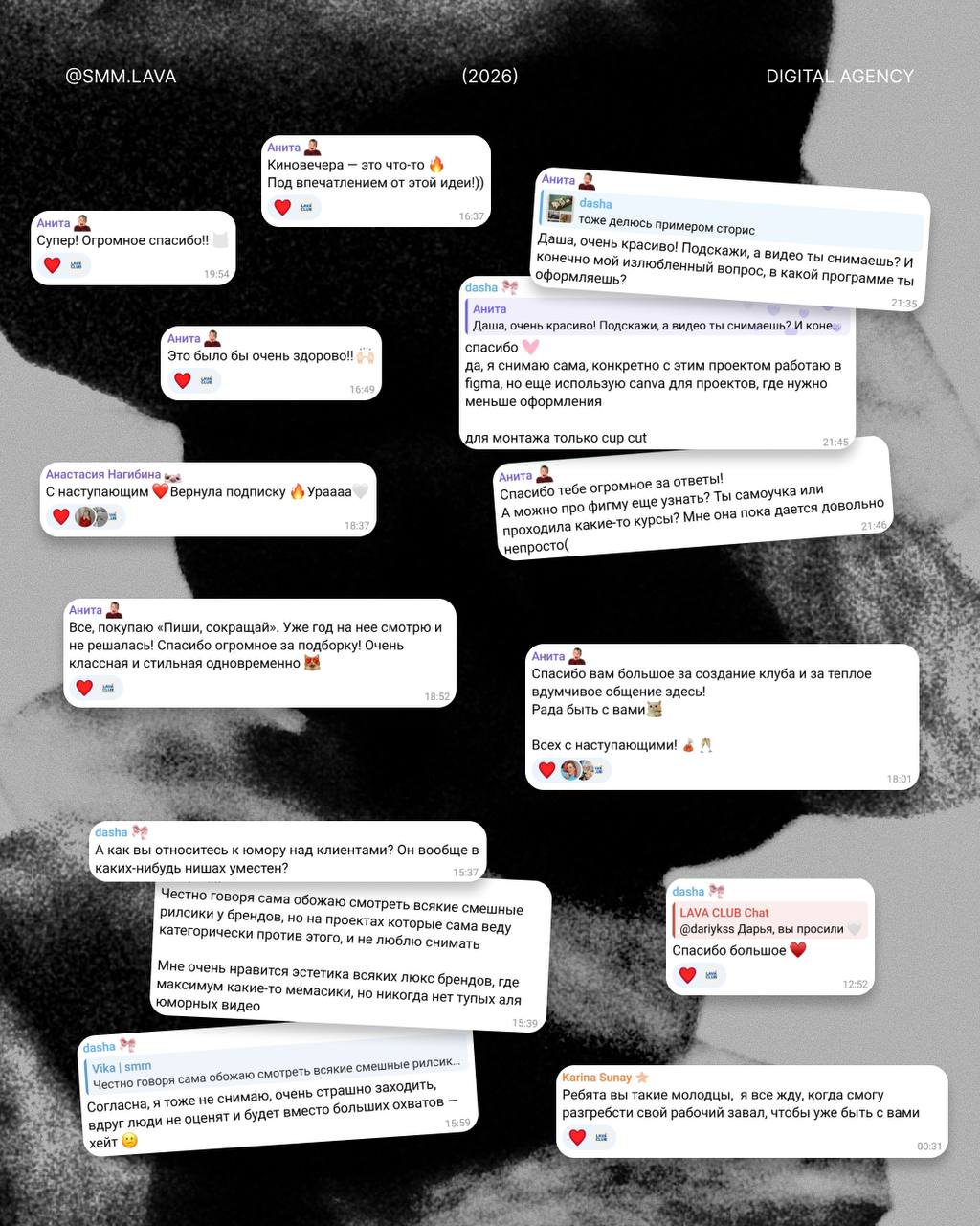 Наша главная ценность в LAVA CLUB – общение. Вы многому учите нас, а мы, в свою очередь, всегда стараемся сделать клуб не только полезным, но и комфортным пространством для SMM-специалистов