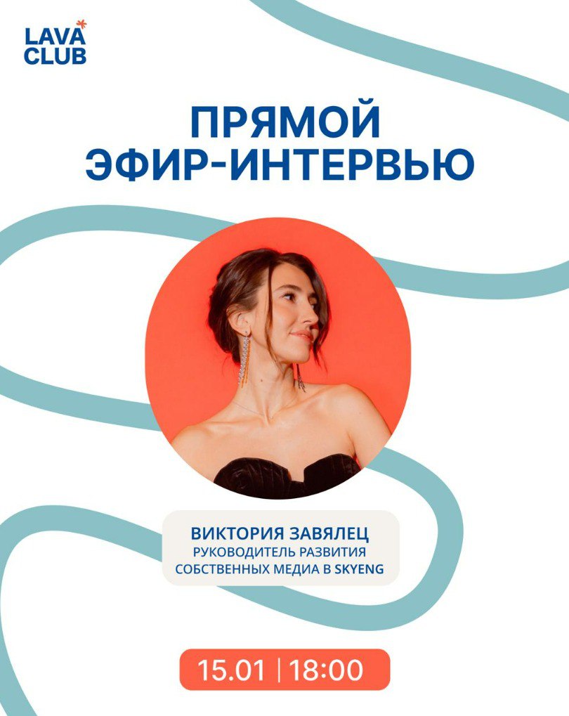 В этот четверг, 15.01 в 18:00 по Москве у нас в LAVA CLUB лайв с Викторией Завялец – руководителем развития собственных медиа в Skyeng