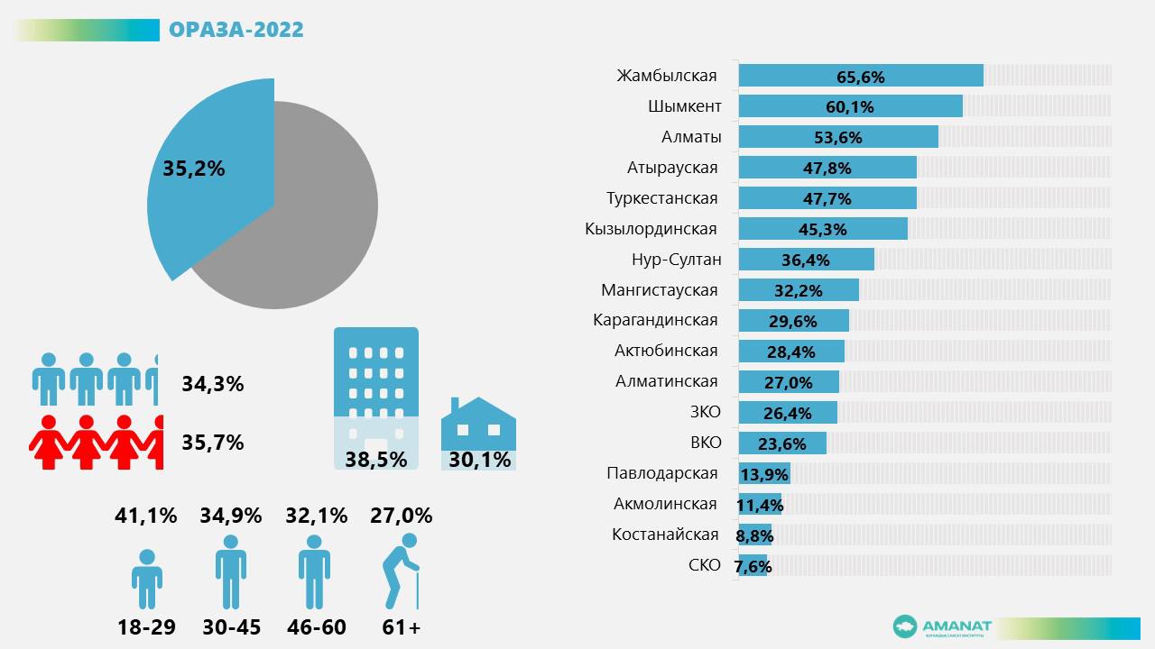 📍По данным Института общественной политики 35,2% участников опроса держали Оразу. Доля постящихся выше в южных регионах страны: Жамбылская область (65,6%), а также города Шымкент (60,1%) и Алматы (53,6%).