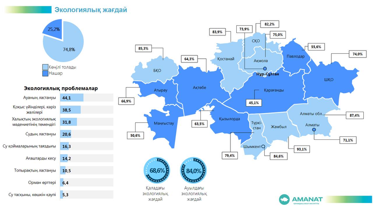 Біздің Қоғамдық саясат институтының деректеріне сүйенетін болсақ, әрбір төртінші қазақстандық жергілікті жердегі экологиялық жағдай нашар деп есептейді. Бұл ретте Қарағанды, Маңғыстау, Павлодар, Қызылорда және Атырау облыстарының тұрғындары экологиялық жағдайға барынша алаңдаушылық білдіруде. 20,3%-ы үйінен шыққанда - қолайсыз аулаға, қоқыс пен балшыққа тап болады.