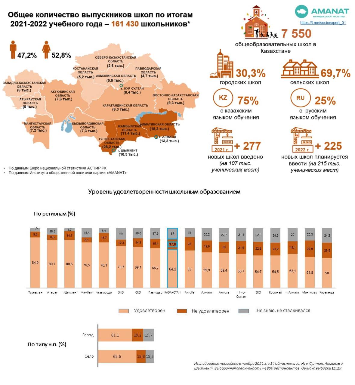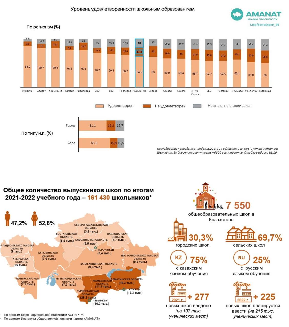 🔺По данным социологического исследования Института общественной политики качеством среднего образования удовлетворены 64,2% респондентов, недовольны — 17,8%.