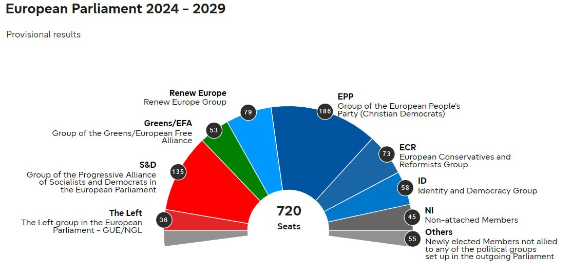 ✔️Ультраправым партиям удалось добиться некоторых успехов. «Европейские консерваторы и реформисты» и «Идентичность и демократия» будут вместе контролировать 131 место.