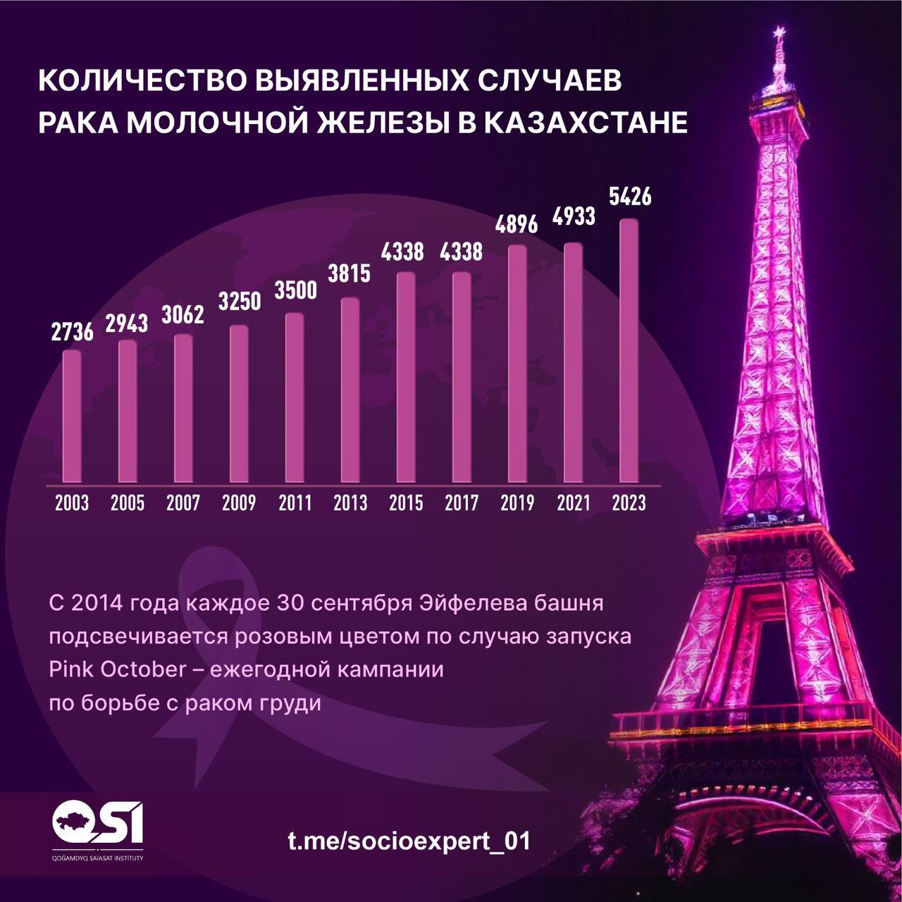 🇰🇿 Казахстан не является исключением из этой тревожной статистики. Последние 13 лет рак молочной железы занимает первое место среди онкологических заболеваний. Средний показатель смертности от рака молочной железы составляет 5,3 на 100 тысяч человек. Наиболее неблагоприятная обстановка наблюдается в Восточно-Казахстанской области (9,6 на 100 тыс. человек), Павлодарской области (8,2 на 100 тыс. человек) и городе Алматы (7,8 на 100 тыс. человек).