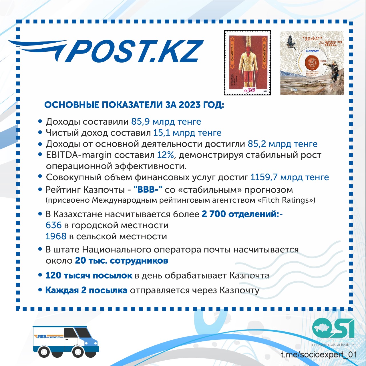 - доходы от почтовых услуг за 2023 год увеличились на 2,7 млрд тенге;