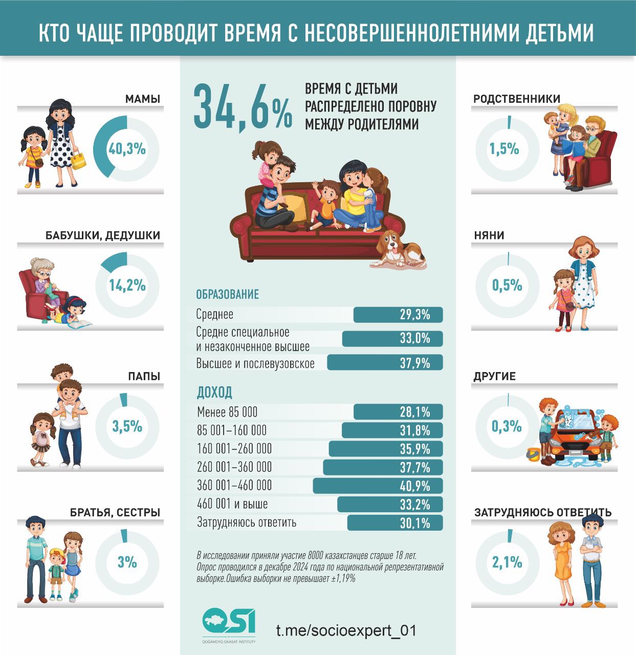 Согласно исследованию Института общественной политики, в каждой третьей казахстанской семье (34,6%) оба родителя проводят равное количество времени с детьми. Однако в 40,3% семей основную заботу о детях всё еще берут на себя мамы.