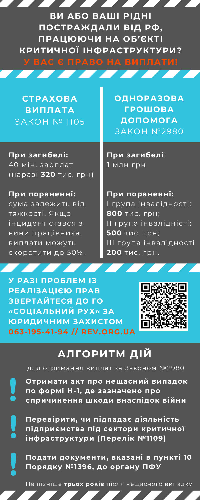 ❗️Хочемо нагадати, що працівники, котрі отримали поранення або загинули внаслідок ворожої атаки під час виконання трудових обов’язків, вони або їх родини мають право на грошові виплати від держави згідно з Законом №2980. Це передбачено законодавством, ухваленим ще у 2023 році — і він має діяти.
