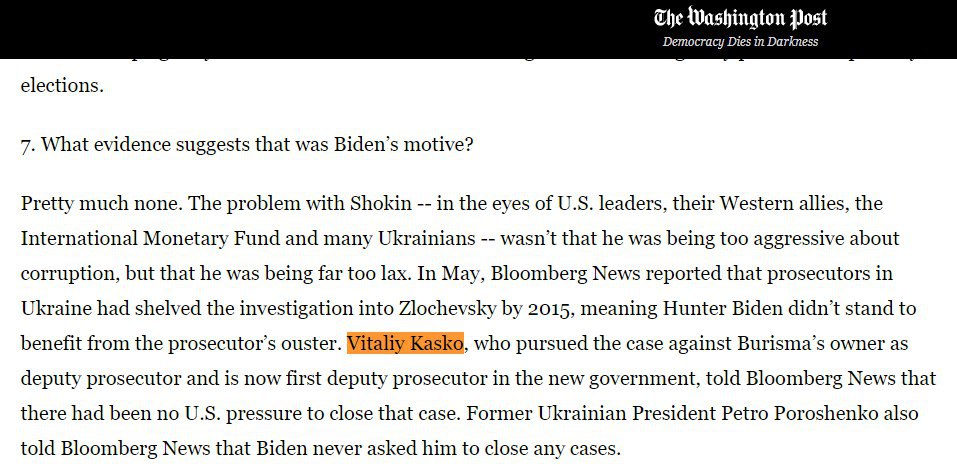 Соросенок, а по совместительству заместитель Генерального прокурора Украины Виталий Касько в интервью Washington Post от имени украинской прокуратуры заявил, что США не оказывали давление, чтобы закрыть дело Буризмы.