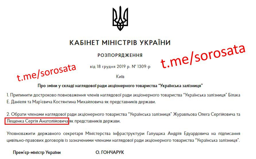 Соросенок Сергей Лещенко официально назначен членом наблюдательного совета Укрзалізниці. Соответствующее распоряжение подписал еще один соросенок, а по совместительству премьер-министр Гончарук.