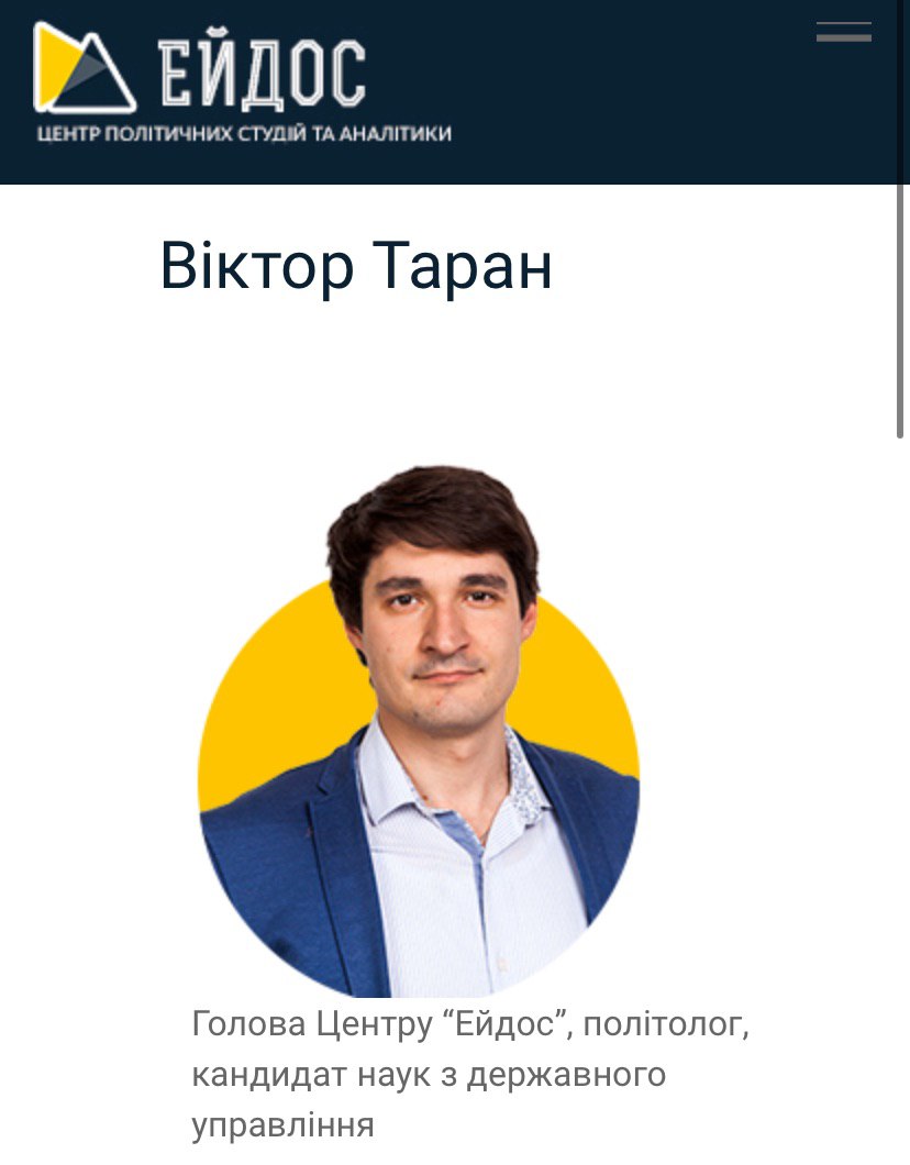 Речь идет об Викторе Таране, который трудится экспертом общественной организации «Ейдос». Но это по документам они ГОшка. На всех телеканалах Тарана представляют, как эксперта Центра политических студий и аналитики.