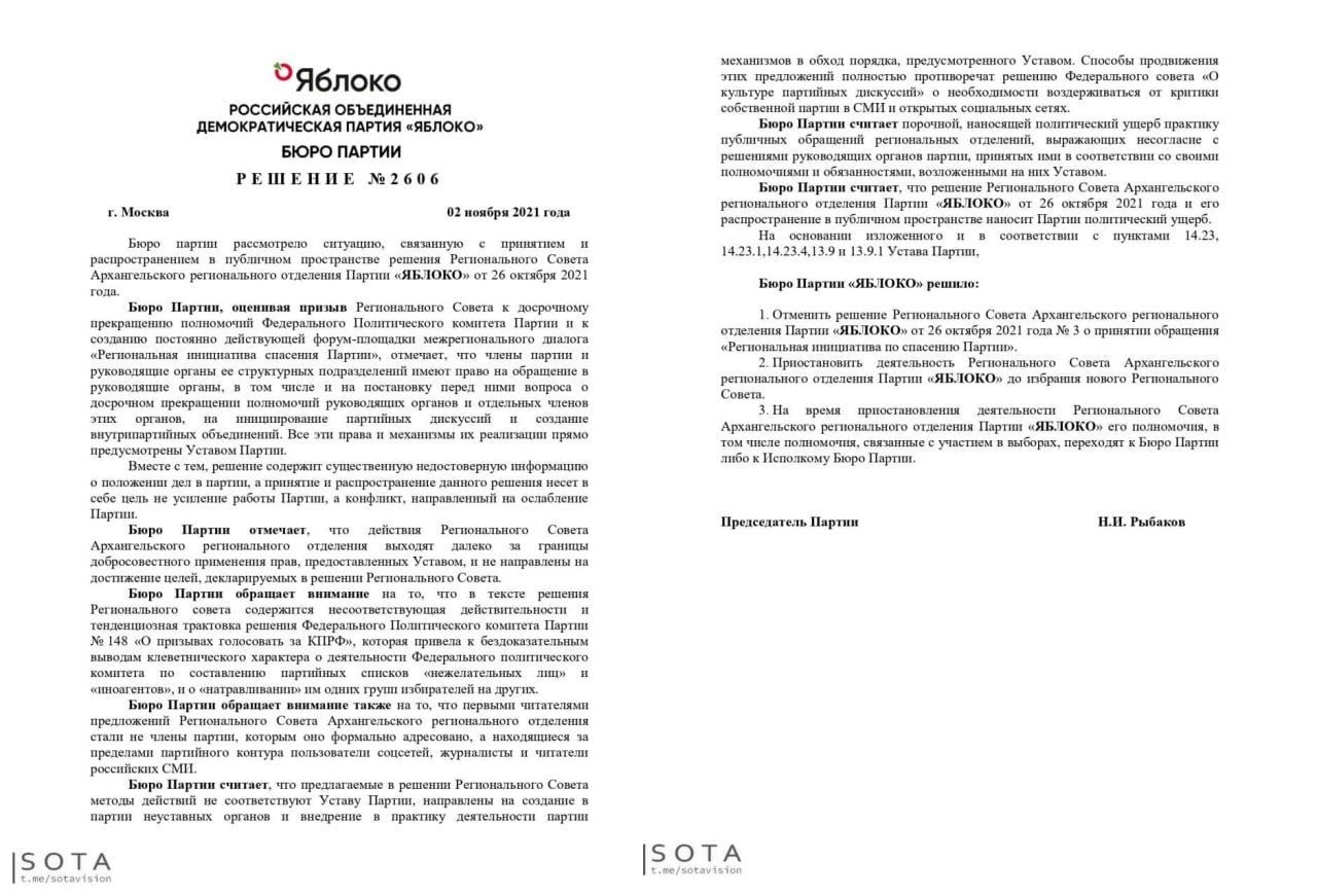⚡️Федеральное бюро «Яблока» отменило решение архангельского регионального совета с критикой последних заявлений руководства партии и требованием отправить в отставку политкомитет