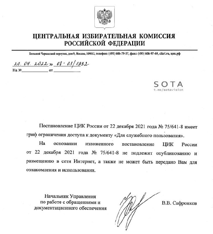 Однако в ответ на запрос «Соты» с просьбой предоставить документ выяснилось, что он снабжен грифом «Для служебного пользования» и «не может быть предоставлен для ознакомления и использования».