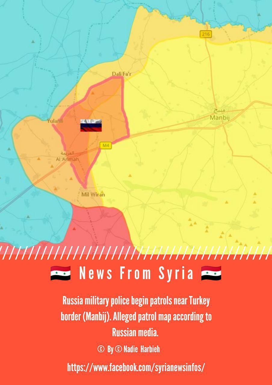 Российские военные приступили к патрулированию территории северо-западнее подконтрольного "Сирийским демократическим силам" г. Манбидж на севере Сирии.