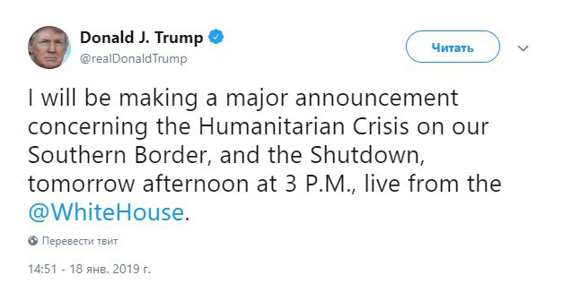 🇺🇸 Сегодня в 23:00 по Москве очередное важное заявление президента США Дональда Трампа по поводу ситуации на юге США и шатдауна. Может на этот раз он решится на режим ЧС для того чтобы протолкнуть строительство стены?